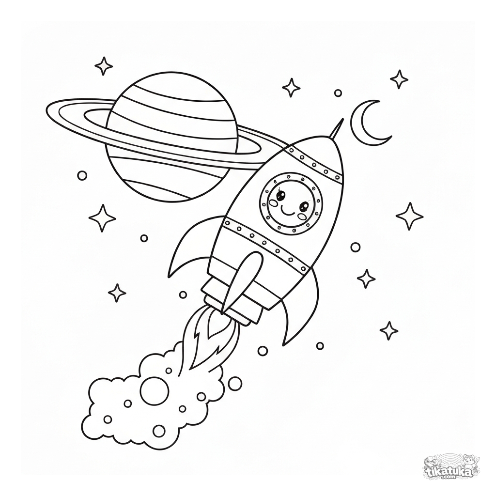Página para colorir de um foguete amigável orbitando um planeta anelado. Para crianças de 5 a 8 anos.
