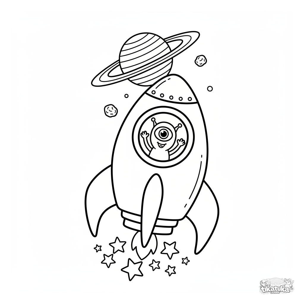 Página para colorir de um foguete amigável com um piloto alienígena orbitando um planeta com anéis. Para crianças de 3-6 anos.