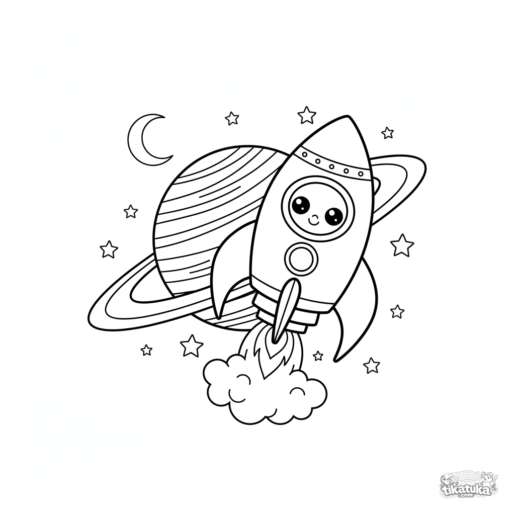 Página para colorir de um foguete de desenho animado orbitando um planeta anelado. Para crianças de 5 a 8 anos. Cena espacial com vigias, estrelas e lua crescente.