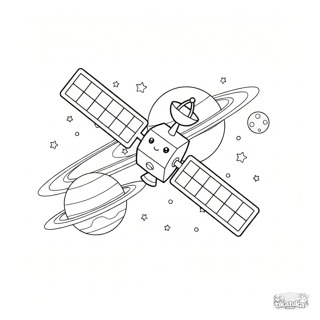 Página simples para colorir para crianças pequenas: satélite no espaço. Satélite amigável com painéis solares orbita um planeta com anéis. Para crianças de 2 a 5 anos.