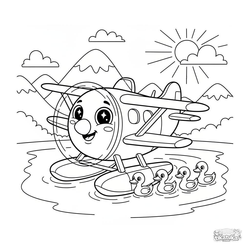 Página para colorir para crianças 7-9: um hidroavião alegre com um sorriso taxiando em um lago de montanha, seguido por patos curiosos. Cena brilhante e dinâmica.