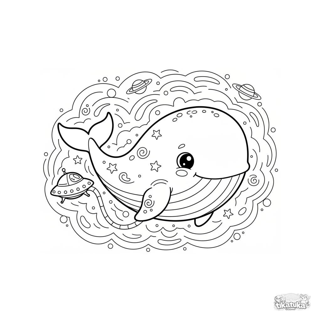 Página para colorir de uma baleia espacial de desenho animado nadando através de uma nebulosa colorida. Para crianças de 3 a 6 anos.