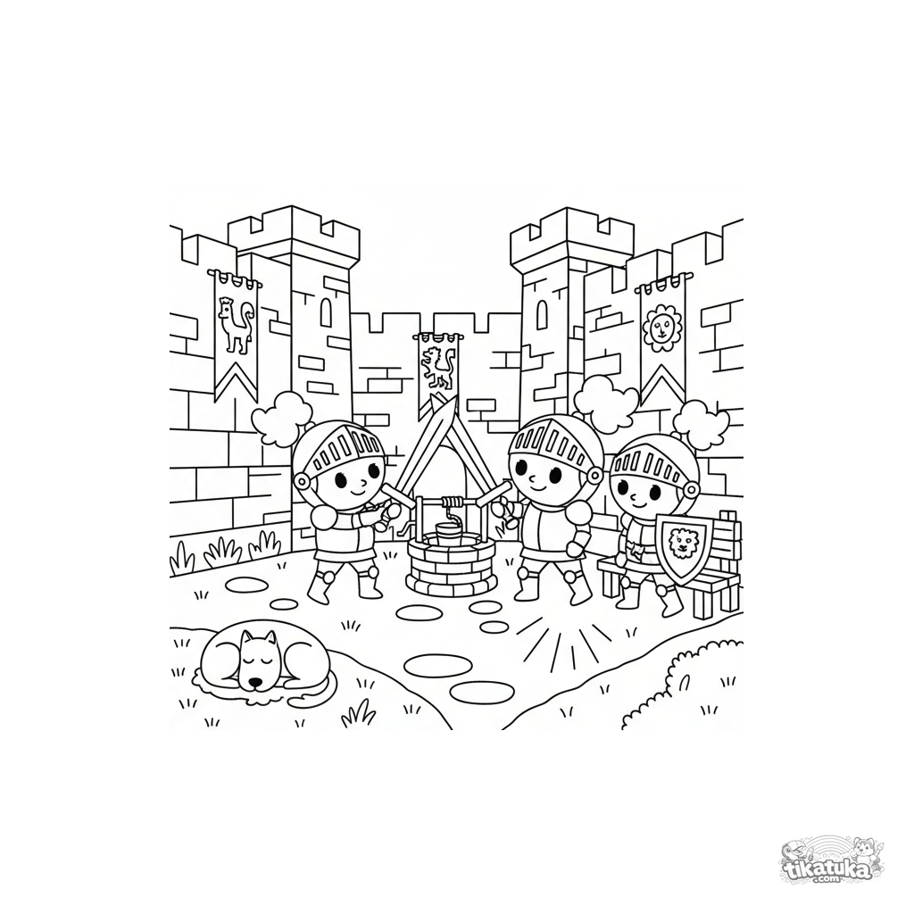 Página para colorir para crianças: um pátio de castelo animado onde cavaleiros praticam e um cachorro dorme. Cena dinâmica em estilo folclórico.