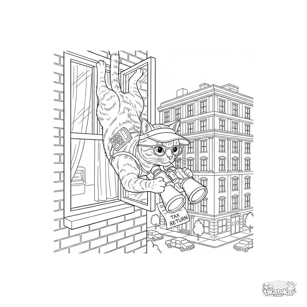 Página para colorir para crianças mais velhas: um gato contador com óculos e uma calculadora observa um banco com binóculos da janela. Meme financeiro engraçado e detalhado.