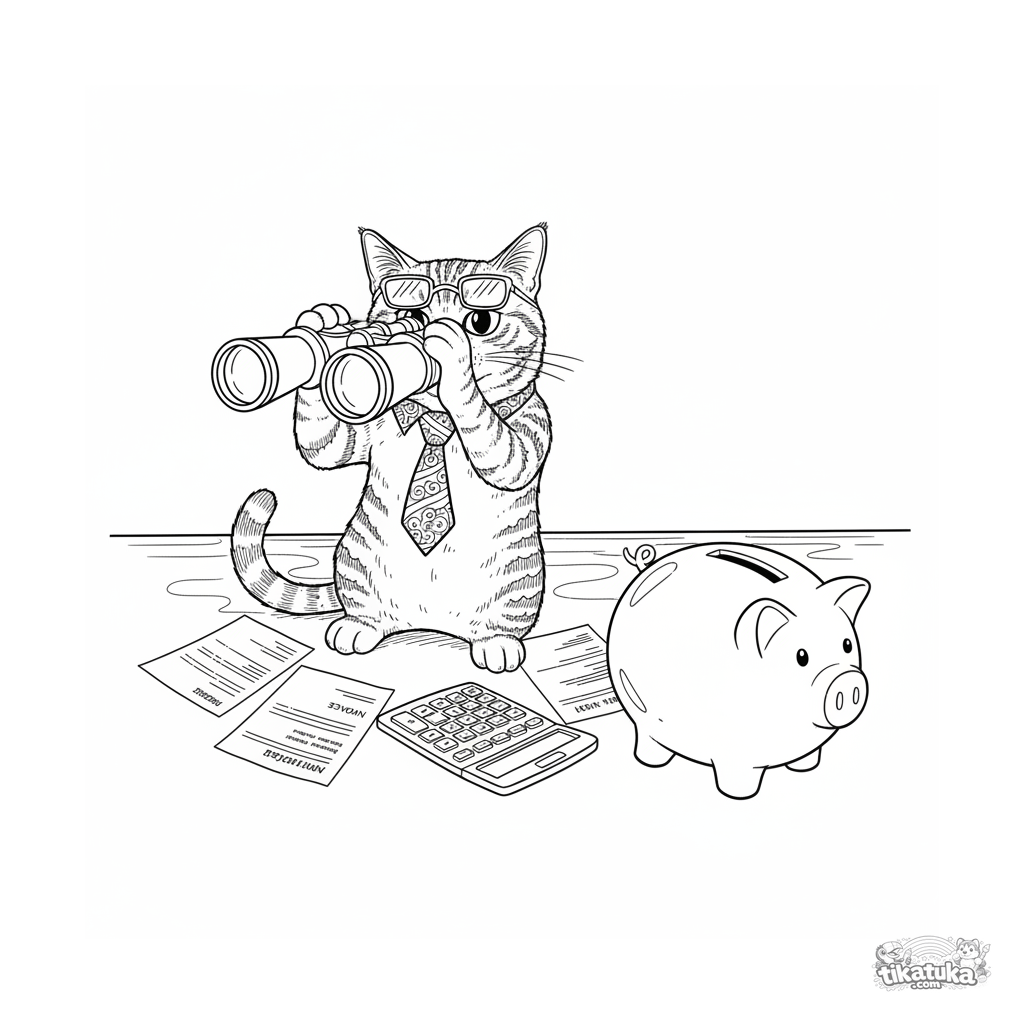 Página para colorir para crianças 10-12: um gato contador de gravata espia com binóculos um cofrinho em seu escritório em casa. Cena engraçada e detalhada de espera do salário.