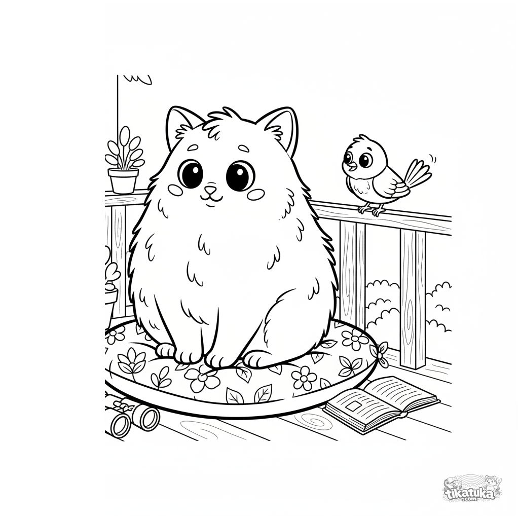 Página para colorir para crianças 4-6: um gato fofo em uma almofada na varanda observa com curiosidade um passarinho no corrimão. Cena doce e engraçada com binóculos.