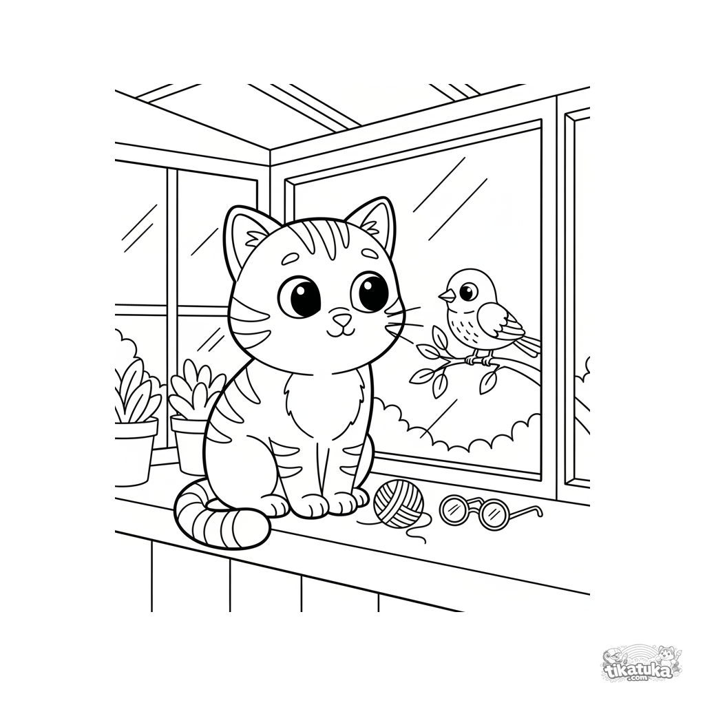 Página para colorir para crianças de 7-9 anos: um gato curioso no parapeito de uma varanda observa um pássaro fora da janela. Cena aconchegante e calma.