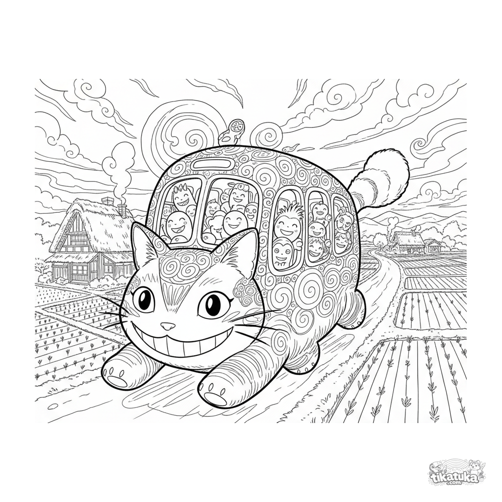 Página para colorir anime aquarela: um ônibus gato alegre corre por uma estrada rural ao pôr do sol. Cena detalhada com campos de arroz e passageiros espíritos para 10-12 anos.
