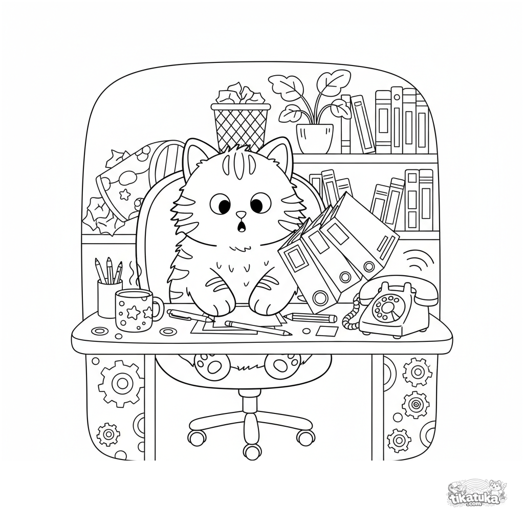 Página para colorir para crianças de 7 a 12 anos: um gato confuso em uma cadeira giratória olha para uma pilha de pastas e um telefone tocando em um escritório. Cena engraçada e reconhecível.