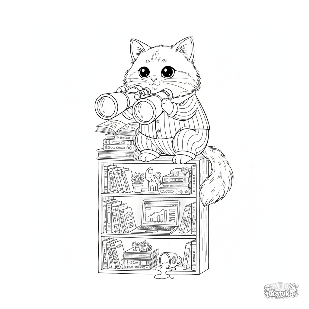 Página para colorir para crianças 10-12: um gato fofo de pijama em uma estante com binóculos procura o salário na tela de um laptop. Cena engraçada detalhada.