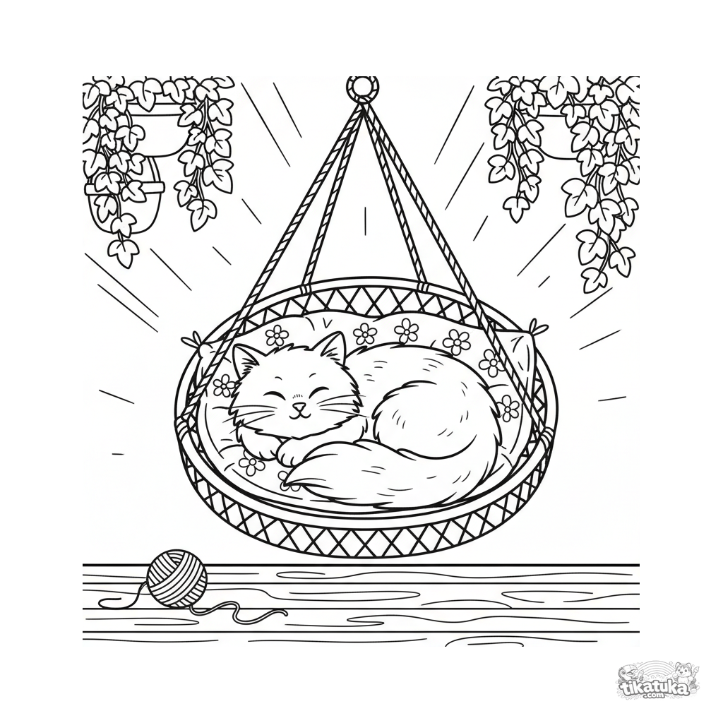 Página para colorir para crianças 4-6: um gato fofo dorme profundamente em uma cadeira suspensa de macramê na varanda de uma casa de campo. Cena aconchegante com uma almofada, novelo de lã e plantas.