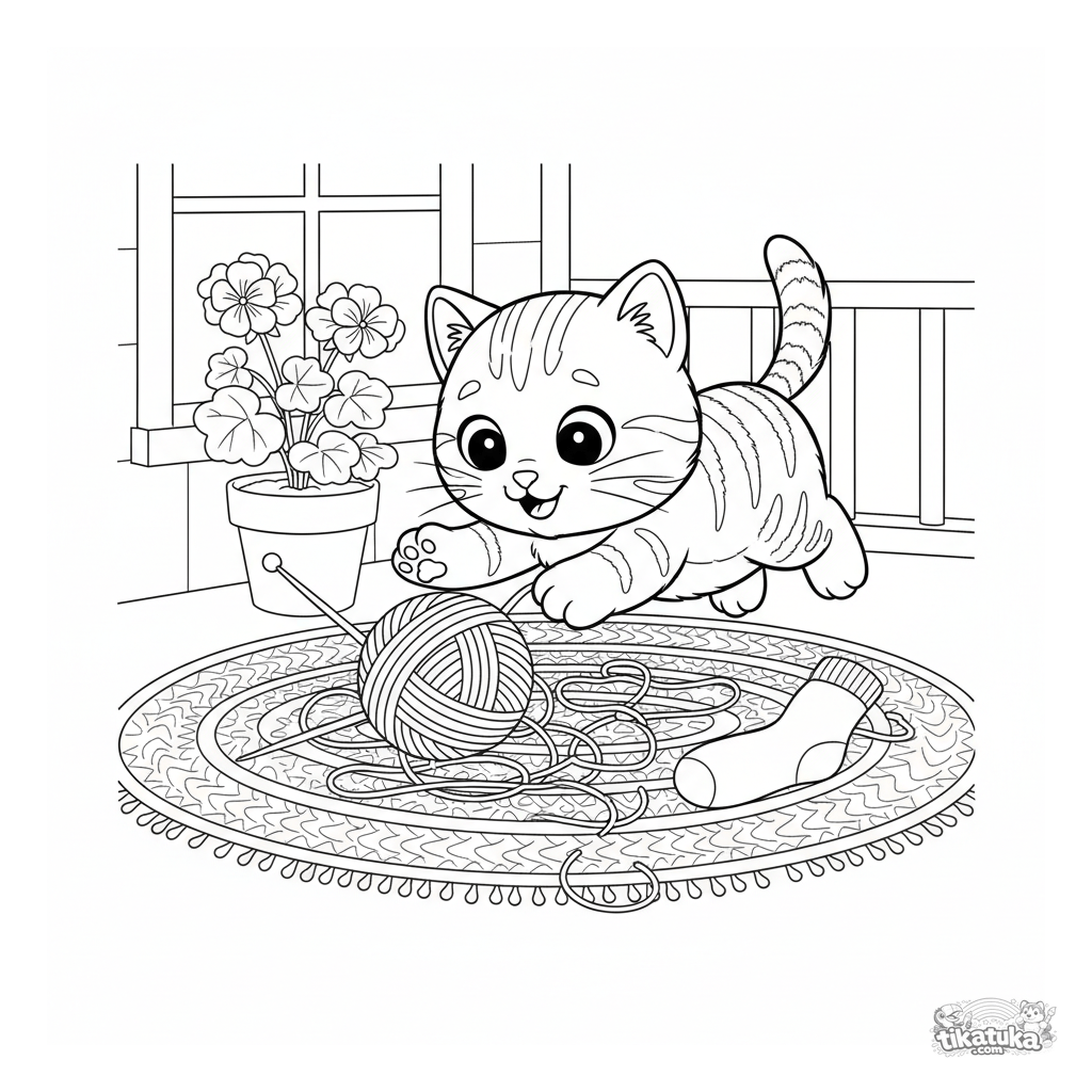 Página para colorir para crianças 4-6: um gatinho brincalhão pulando em um novelo de lã no tapete da varanda. Cena divertida com agulhas de tricô e flores para colorir.