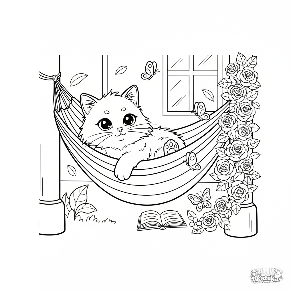 Página para colorir para crianças 4-6: um gato fofo relaxa em uma rede observando borboletas. Cena fofa e calma com detalhes simples para colorir.