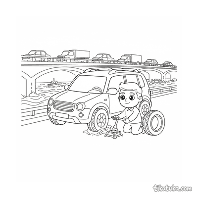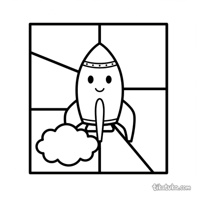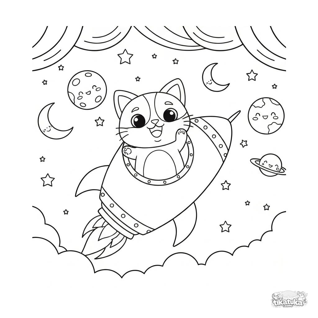 Um Cachorrogato alegre voa em um foguete amigável entre estrelas e planetas. Uma ótima página para colorir para pequenos sonhadores!