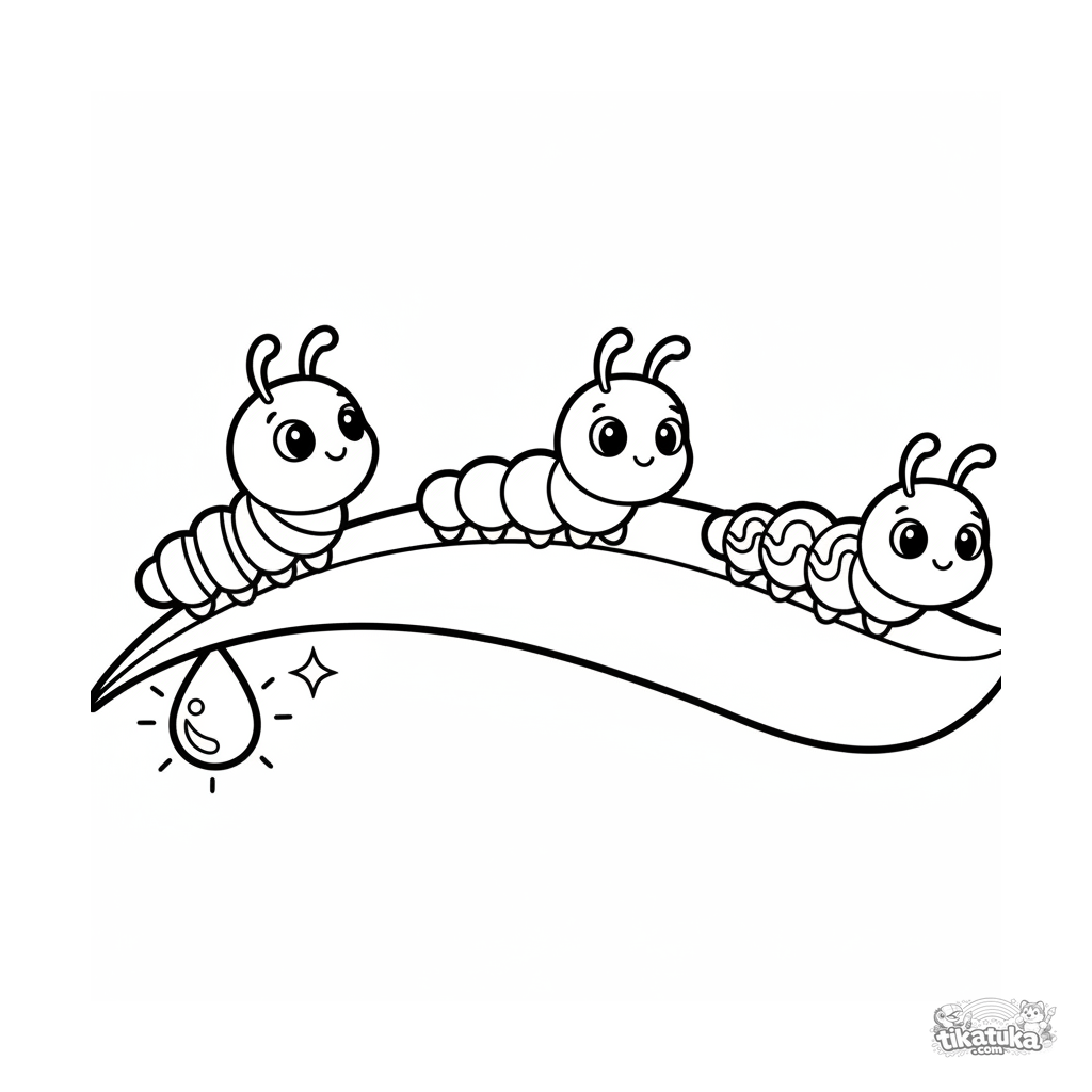 Página para colorir para crianças pequenas 2-3: três lagartas alegres desfilando por uma ponte de folha sobre uma gota de orvalho. Formas simples.