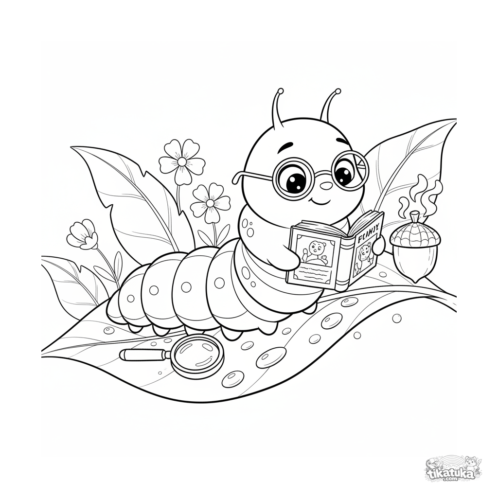 Página para colorir de uma lagarta lendo um livro em uma folha grande com orvalho. Para crianças de 4 a 6 anos.