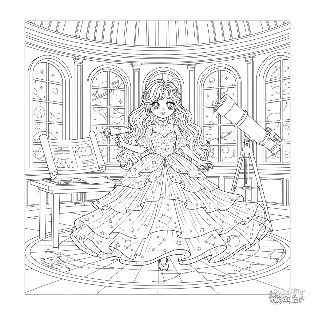 Página para colorir mágica para meninas 10-12: vestido de gala com constelações bordadas em um observatório. Estilo anime detalhado, mapas astronômicos e instrumentos.