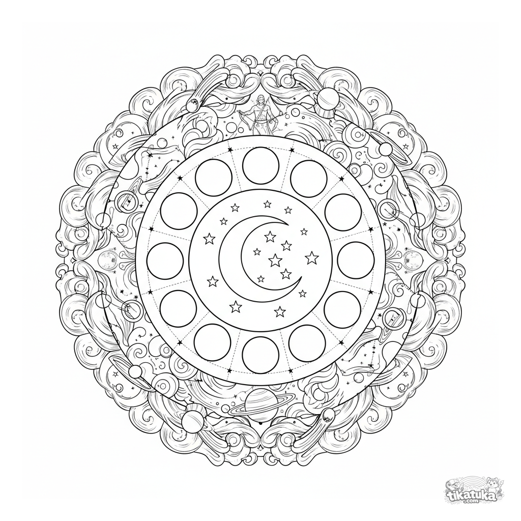 Página para colorir de mandala celestial detalhada para 10-12 anos. Retrata a lua, estrelas, fases da lua, constelações e planetas em um padrão circular simétrico.