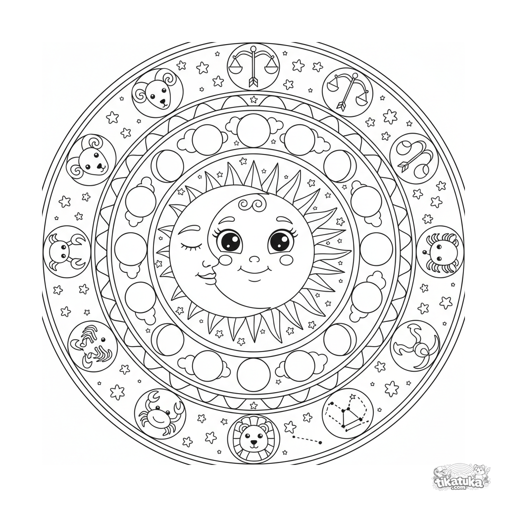 Página para colorir mandala celestial do sol e da lua para crianças de 10-12 anos. Inclui fases da lua, estrelas e símbolos do zodíaco. Design simétrico complexo com alto detalhe.