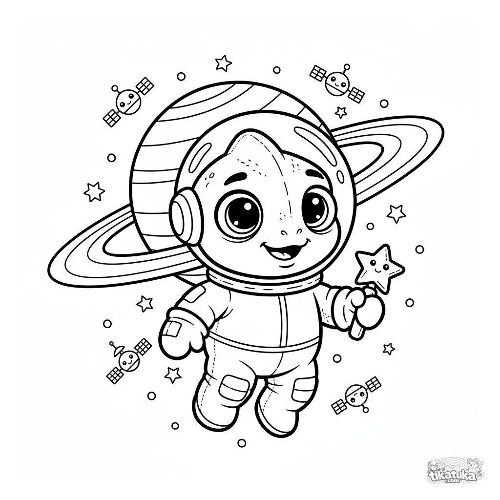 Página para colorir para crianças 4-6: camaleão Radik em traje de astronauta flutua perto de um planeta anelado. Fofo bicho de pelúcia escandinavo no espaço.