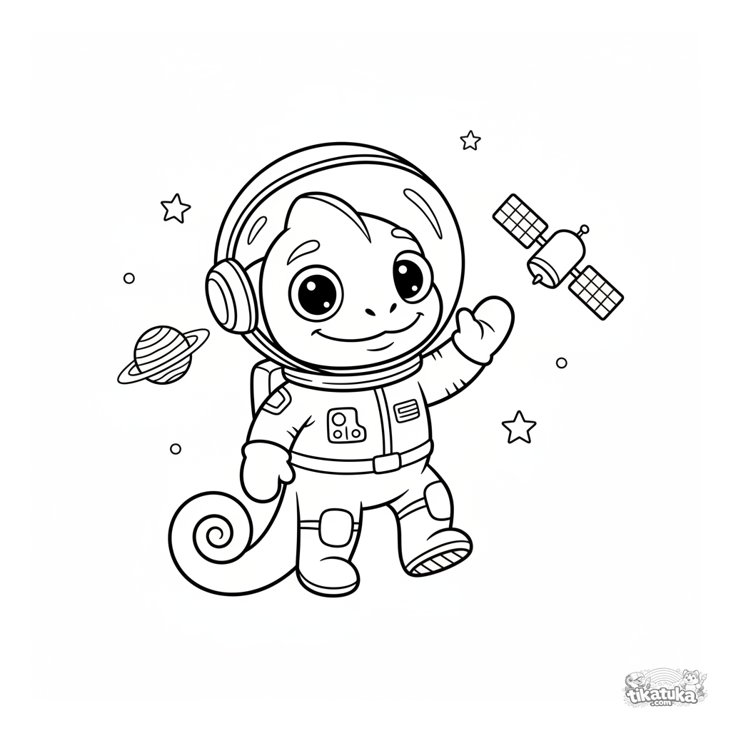 Página para colorir para crianças de 4-6 anos: o camaleão Radik em um traje espacial flutua feliz no espaço sideral, acenando para um pequeno satélite.