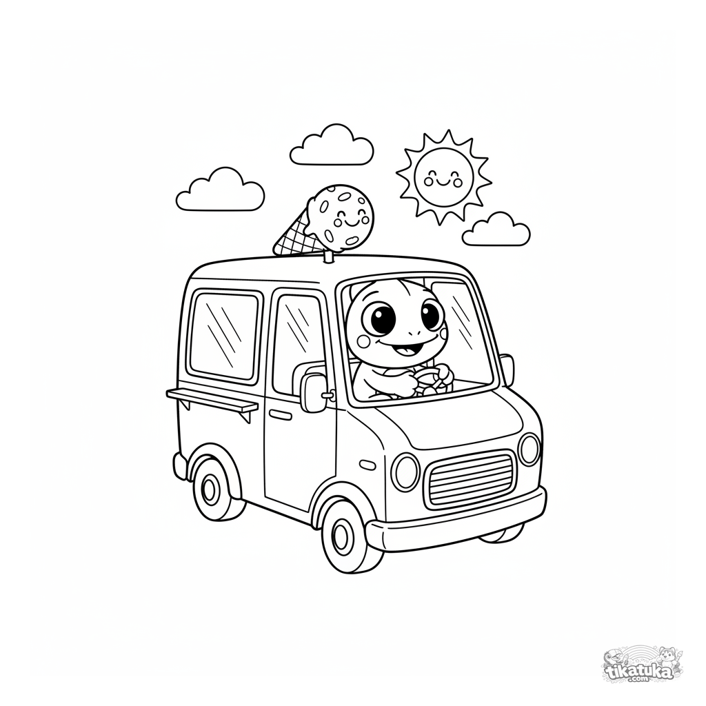Página para colorir para meninos de 4-6 anos. Camaleão Radik dirige uma caminhonete retro de sorvete alegre. Estilo de mascote de pelúcia, formas reconhecíveis do veículo, margens amplas para colorir.