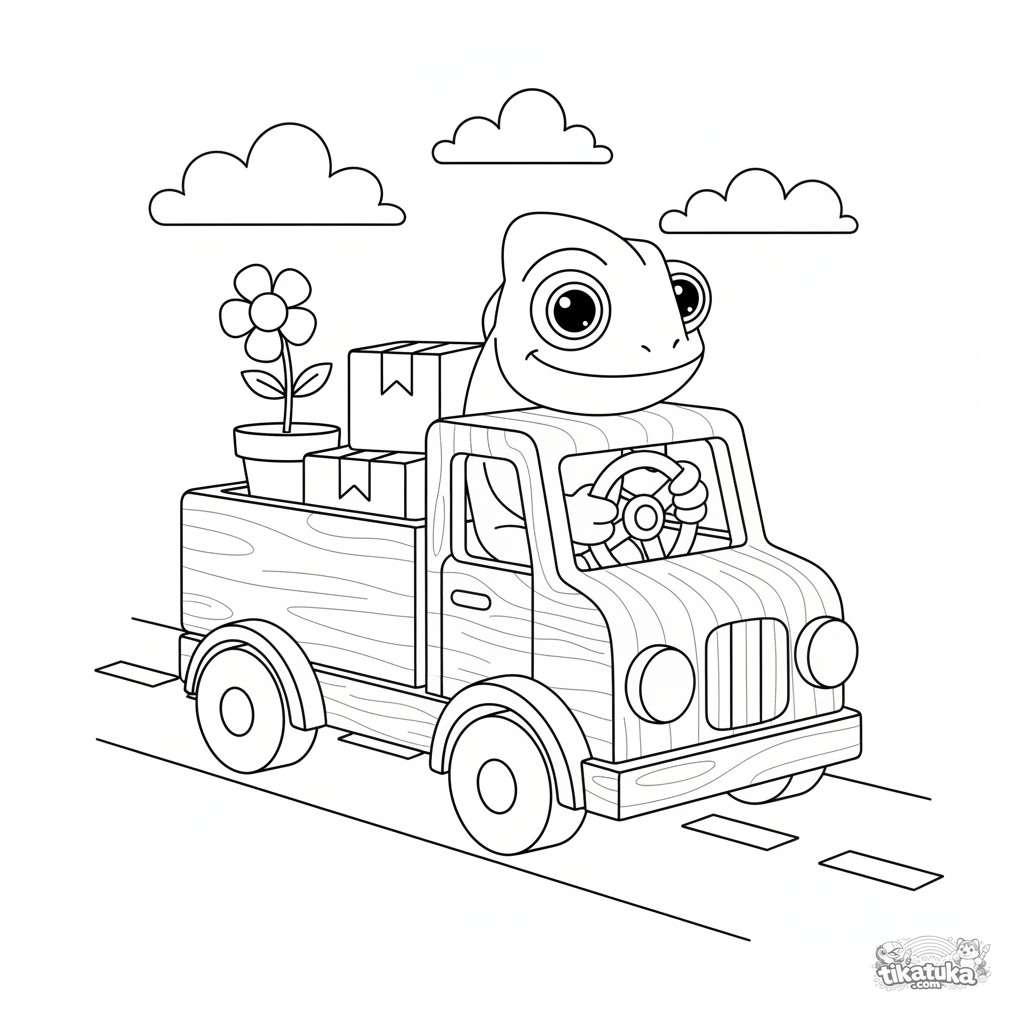 Página para colorir de veículos para meninos 4-6: camaleão Radik dirige um caminhão de entrega de brinquedo de madeira com pacotes. Formas geométricas claras, veículo reconhecível, fundo simples.
