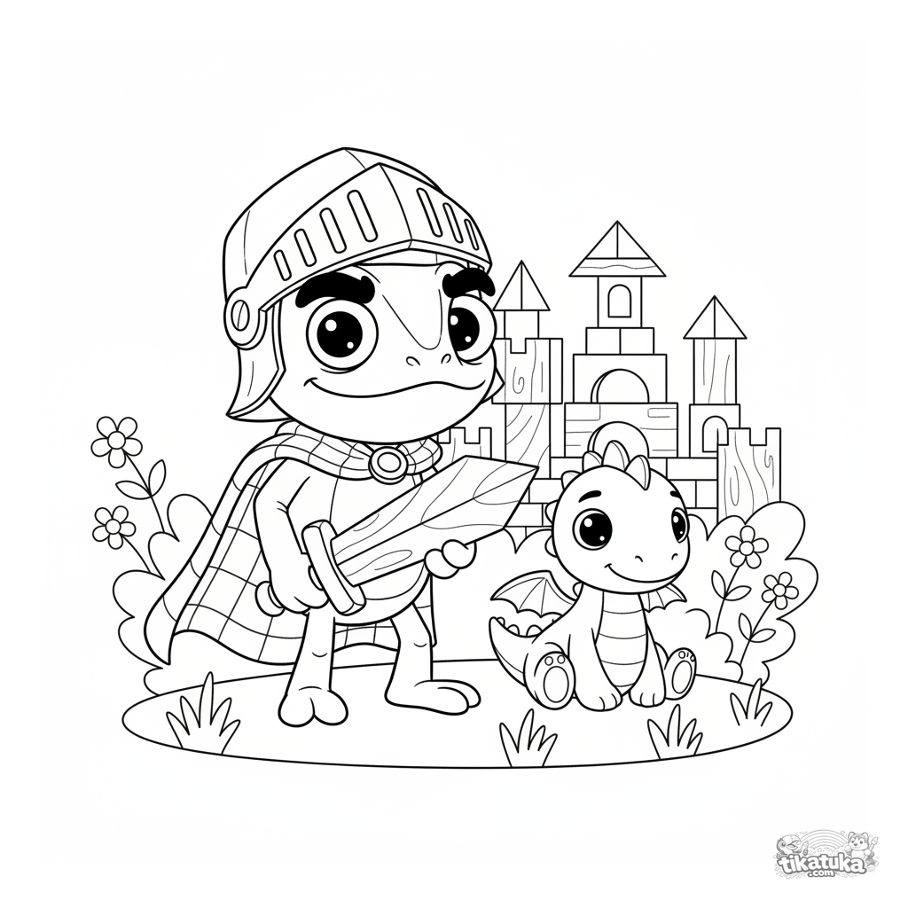 Página para colorir para meninos de 4-6 anos: camaleão Radik vestido de cavaleiro brincando com um dragão amigável perto de um castelo de brinquedo. Estilo de brinquedo de madeira.