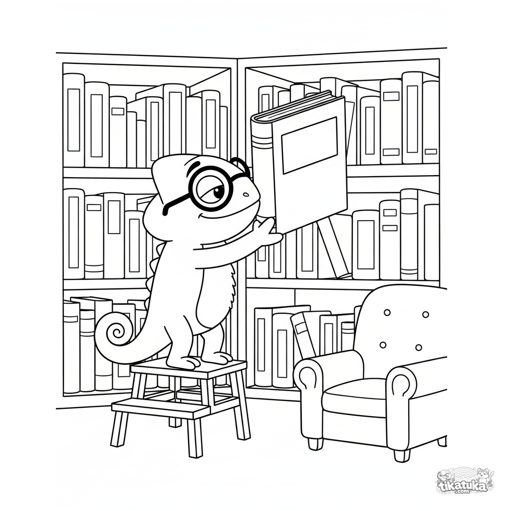 Página para colorir infantil: camaleão Radik trabalha como bibliotecário num cantinho de livros aconchegante. Cena fofa sobre leitura.