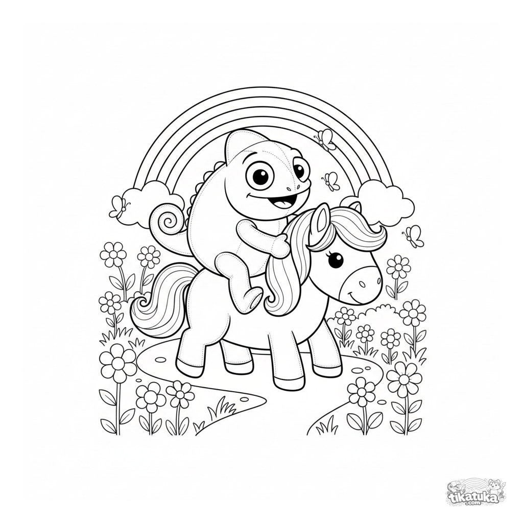 Página para colorir para meninas de 4-6 anos: camaleão Radik montando um pônei mágico sob um arco-íris num campo florido. Estilo de boneco de pelúcia.