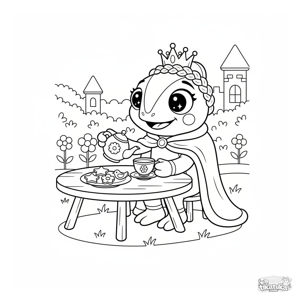 Página para colorir para meninas de 4-6 anos: camaleão Radik como uma princesa doce em um chá da tarde no jardim do castelo. Estilo de boneco de pelúcia escandinavo.