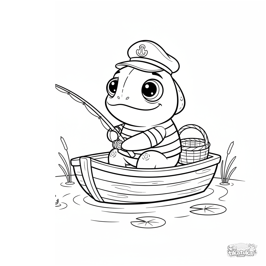 Página para colorir infantil: camaleão Radik pescando de um barco num lago calmo. Cena pacífica e fofa sobre água.