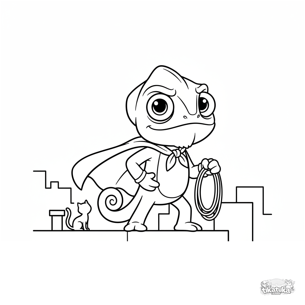 Página para colorir infantil: camaleão Radik como super-herói no telhado de uma cidade. Cena dinâmica e inspiradora sobre coragem.