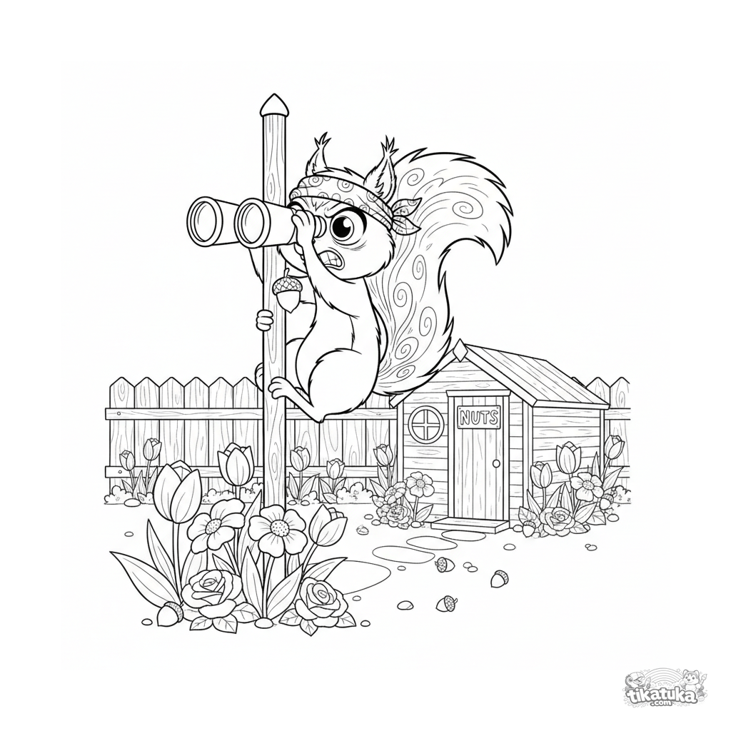 Página para colorir para crianças de 10-12 anos: um esquilo caótico no estilo anime pendurado em um alimentador de pássaros, usando binóculos para procurar nozes no galpão. Cena de meme dinâmica.