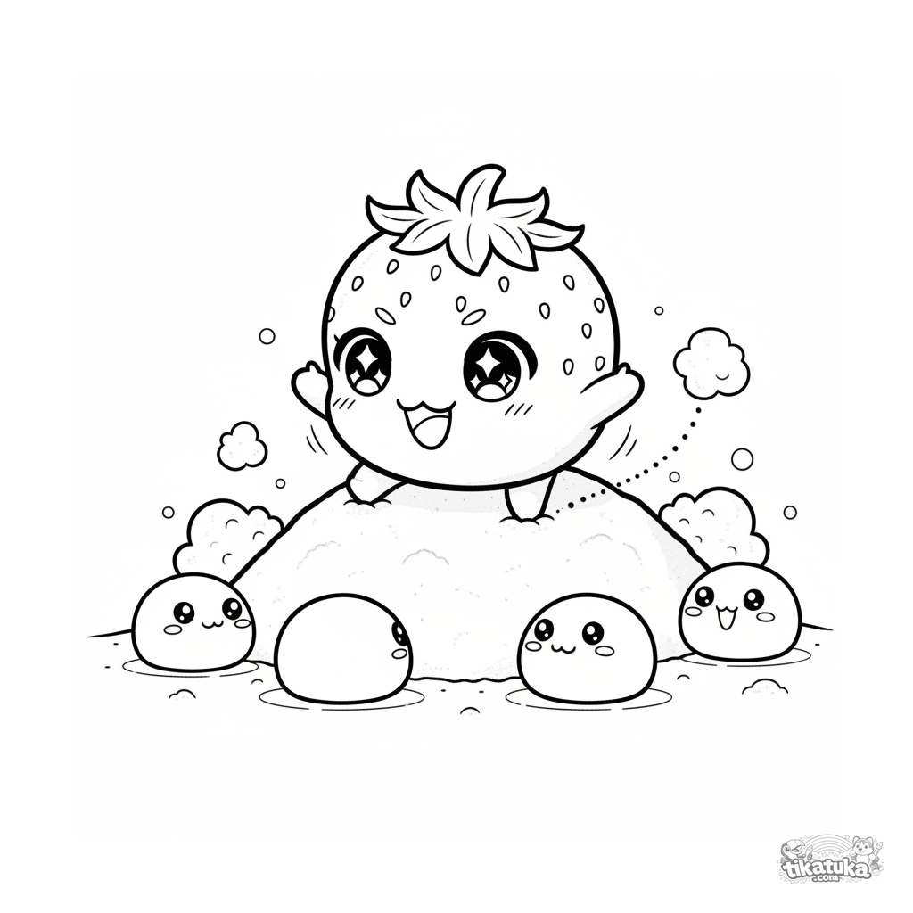 Página para colorir para crianças de 4-6 anos: um mochi de morango travesso rolando alegremente montanha de açúcar de confeiteiro abaixo. Cena dinâmica com emoções fofas.