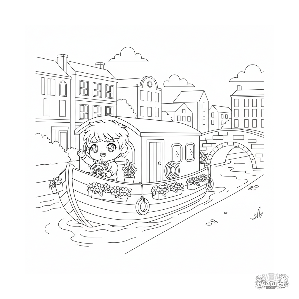 Página para colorir para crianças de 4-6 anos: uma barcaça alegre com vasos de flores navega por um canal urbano ensolarado sob uma ponte. Cena brilhante e amigável.