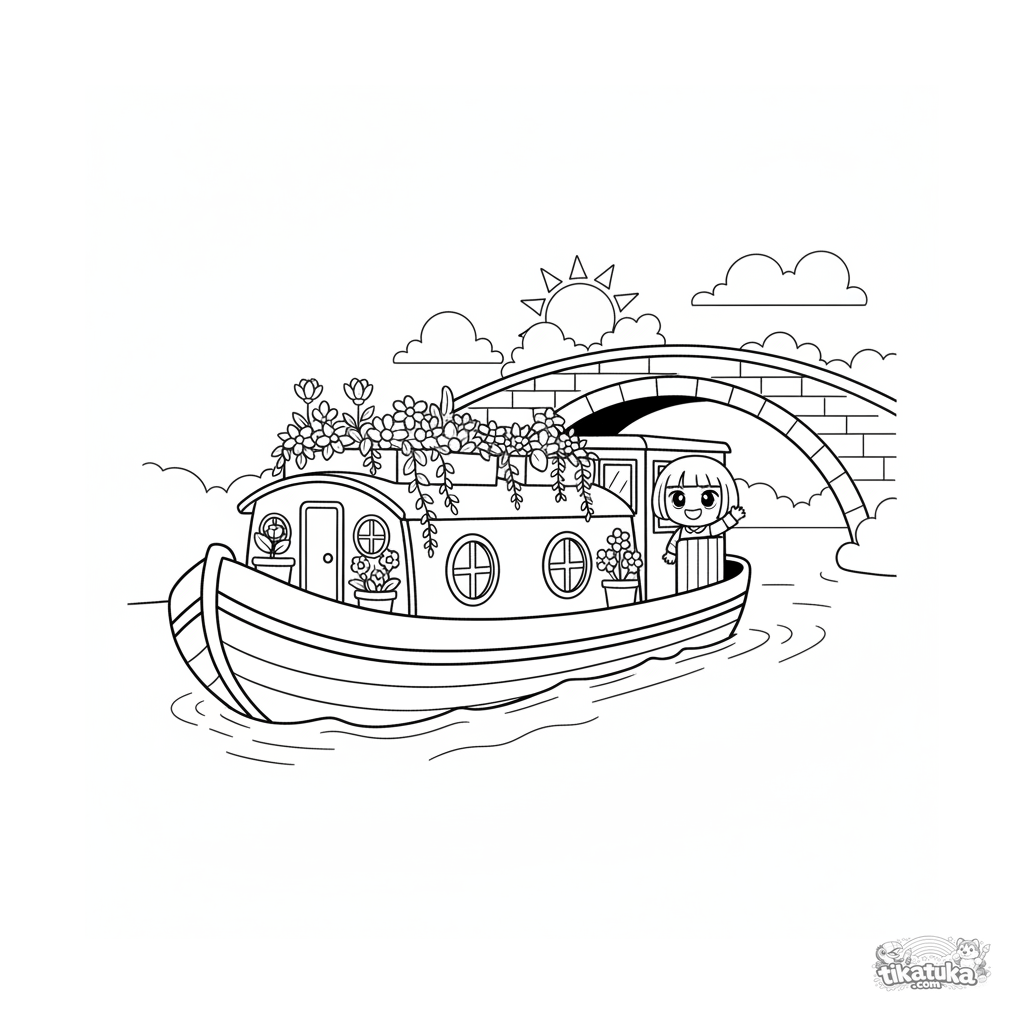 Página para colorir para crianças de 4-6 anos: uma barcaça alegre com caixas de flores navega por um canal sob uma ponte de pedra.