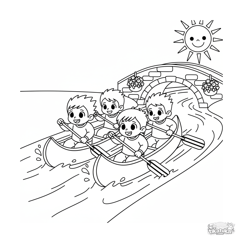 Página para colorir para crianças 4-6: canoas alegres correm por um canal ensolarado sob uma ponte de pedra. Cena dinâmica com formas legíveis.
