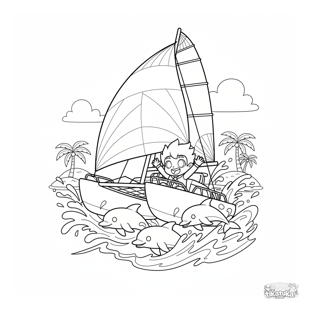 Página para colorir para crianças 7-9: um catamarã veloz corre em uma baía tropical ensolarada, com seu spinnaker inflado e golfinhos brincalhões ao lado.