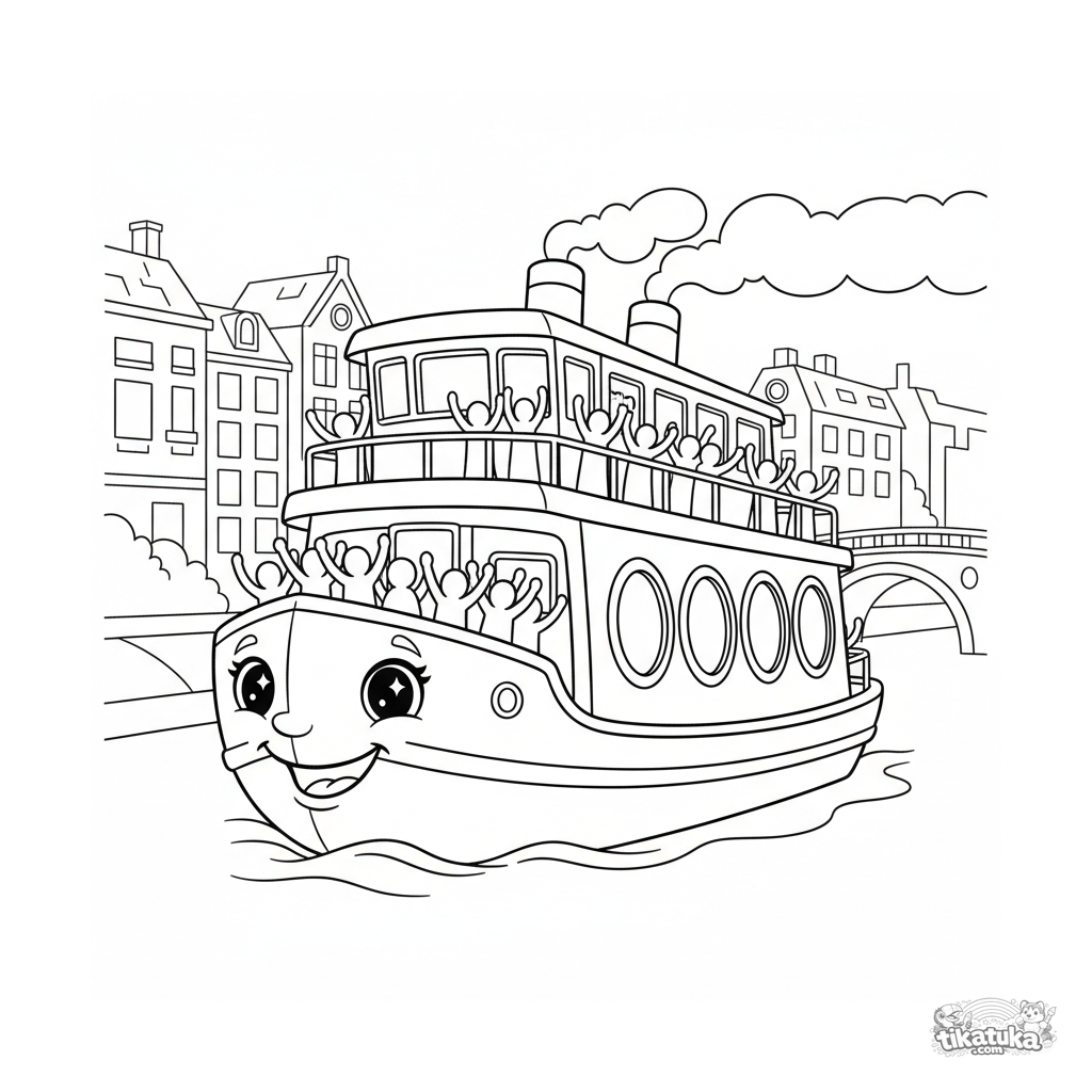 Página para colorir para crianças 4-6: uma balsa fluvial alegre navega por um canal da cidade. Muitas janelas e passageiros.