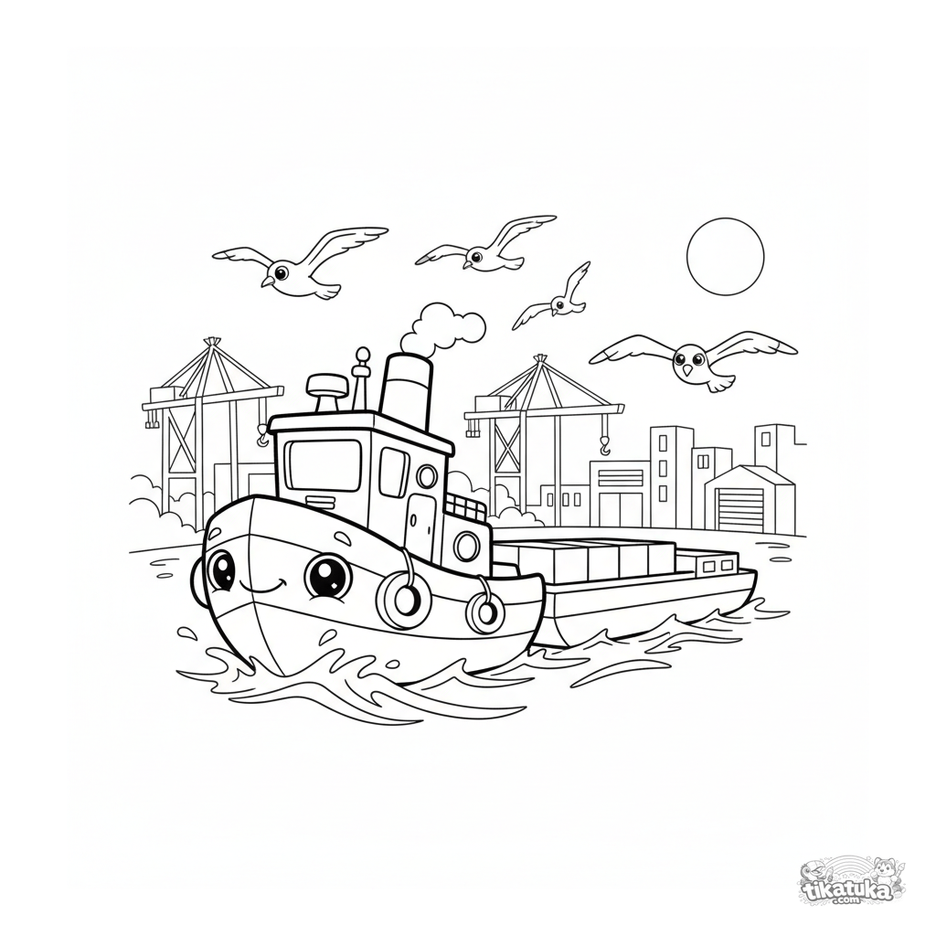 Página para colorir para 7-9 anos: um rebocador alegre empurra uma barcaça de carga em um porto movimentado e ensolarado. Cena dinâmica com gaivotas e guindastes.