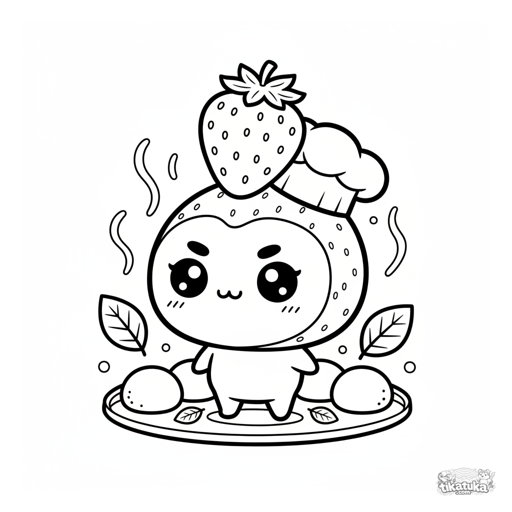 Página para colorir para crianças 4-6: um mochi fofo com chapéu de chef equilibra um morango em uma bandeja. Cena divertida entre outros mochi.