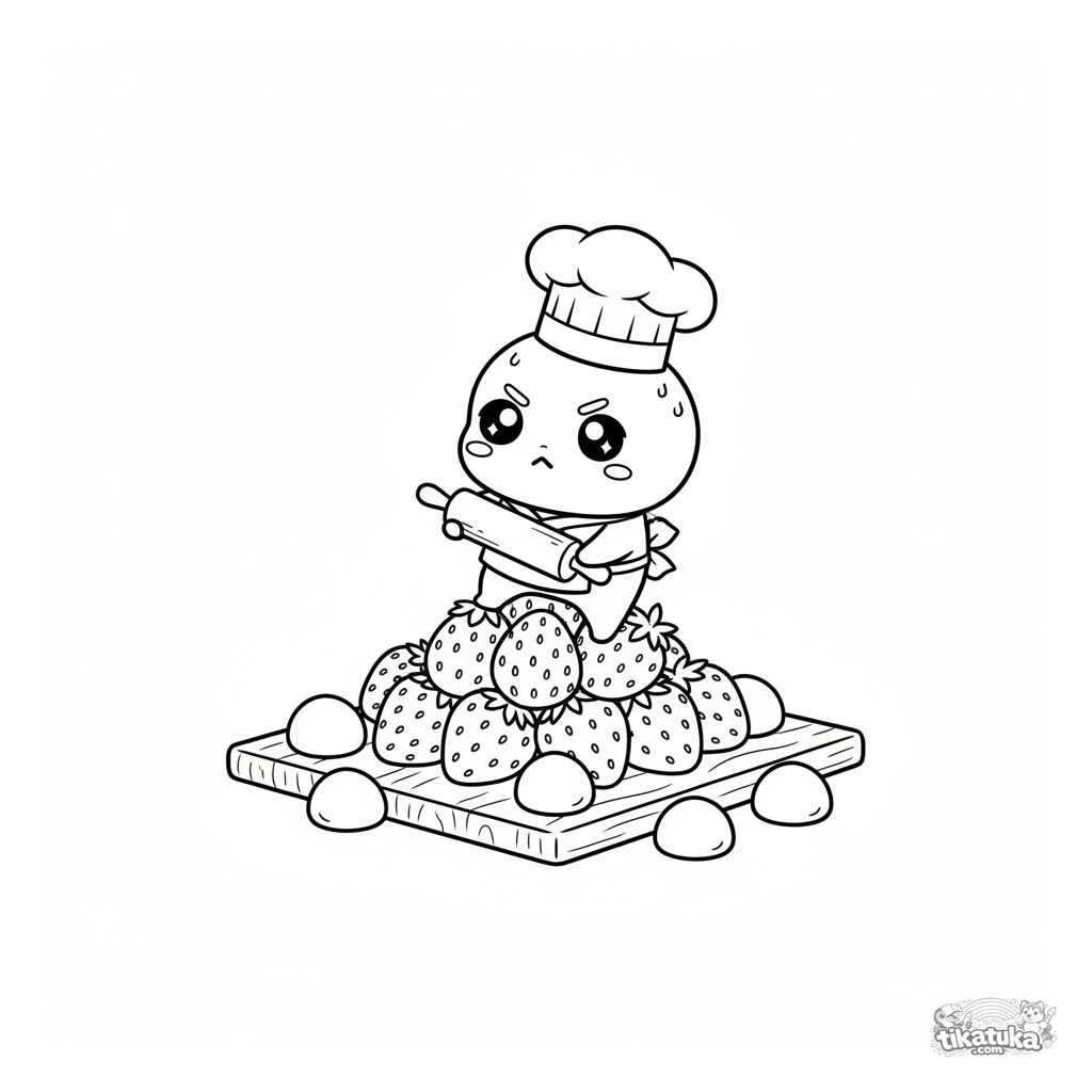 Página para colorir para crianças 4-6: um mochi fofo com chapéu de chef equilibra-se numa pilha de morangos com um rolo. Cena entre outros mochis.