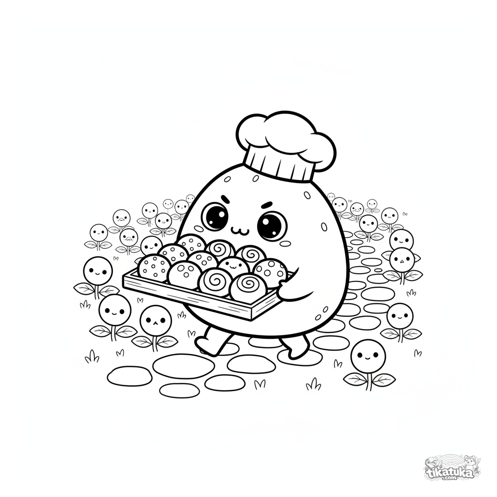 Página para colorir para pré-adolescentes 7-9: mochi chef trabalhador com chapéu carrega uma bandeja de sobremesas em um caminho de pedra. Cena com ação.