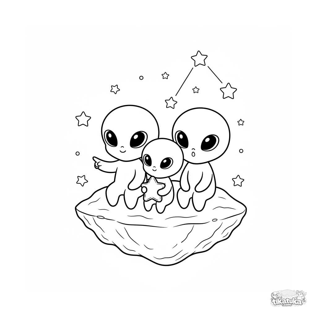 Página para colorir para 4-6 anos: uma família alienígena fofa flutua no espaço em uma rocha, olhando para as estrelas. Formas simples, personagens amigáveis.