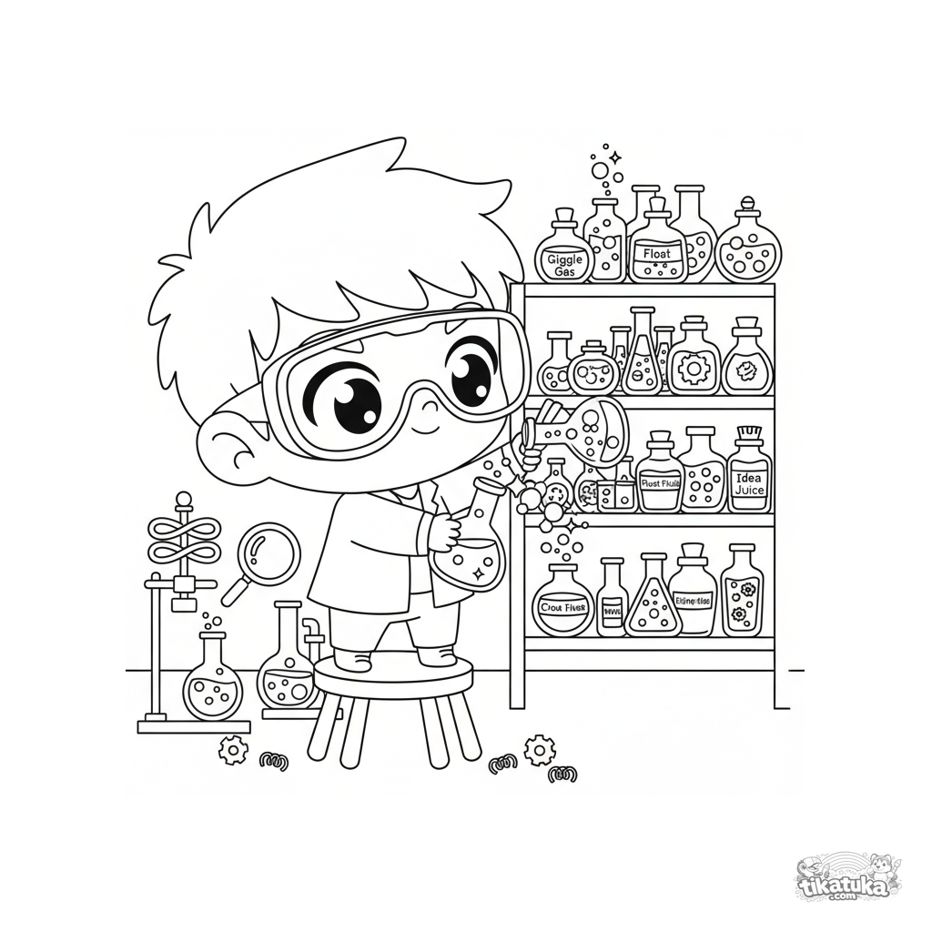 Página para colorir estilo chibi para crianças 4-6: um menino fofo com óculos de segurança gigantes mistura poções engraçadas em uma prateleira de um laboratório secreto.