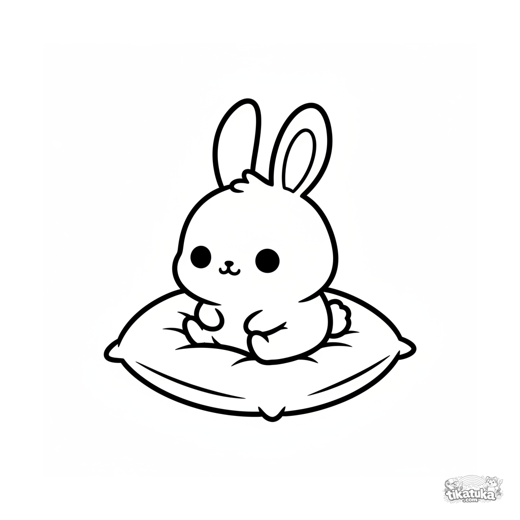 Página para colorir mais fofa estilo chibi: um coelhinho com cabeça grande e orelhas moles sentado em um travesseiro. Proporções exageradamente fofas.