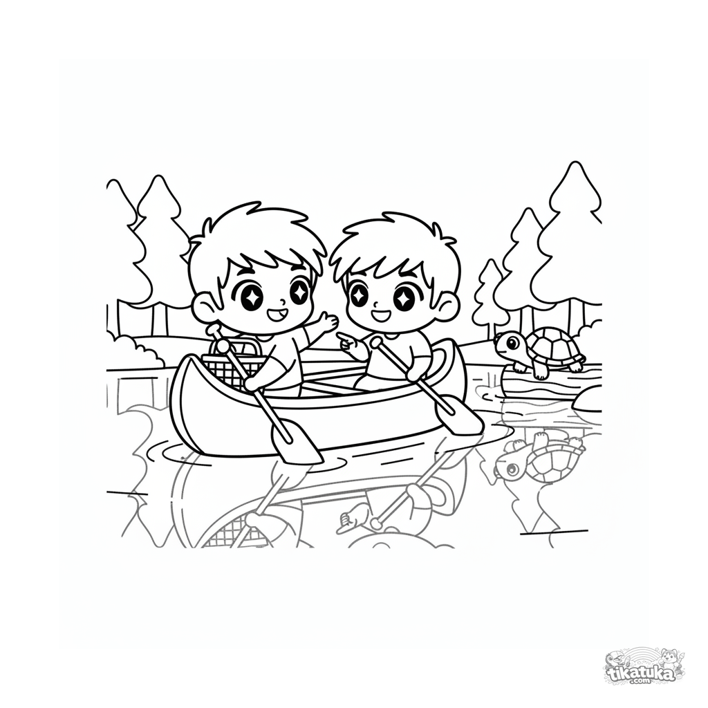 Página para colorir estilo chibi para crianças de 4-6 anos: uma canoa alegre com dois remadores desliza em um lago florestal calmo. Cesta de piquenique e uma tartaruga em um tronco.