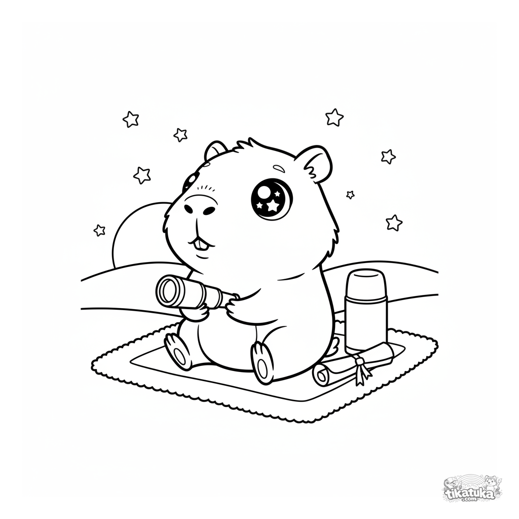 Página para colorir estilo chibi: uma capivara astrônoma com telescópio aguarda o pôr do sol. Para crianças de 4 a 6 anos, formas simples.