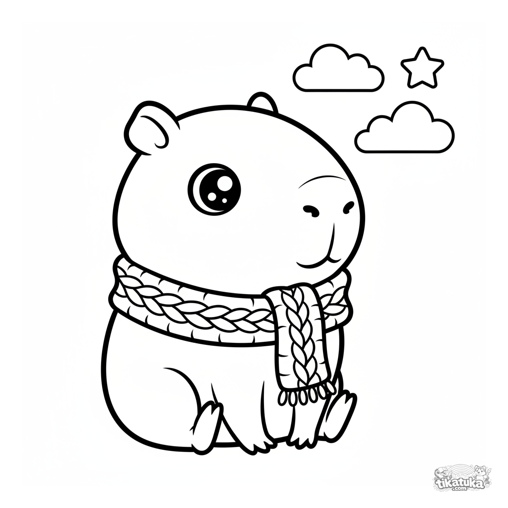 Página simples para colorir para bebês de 2-3 anos: uma fofa capivara chibi com cachecol sentada observando o pôr do sol.